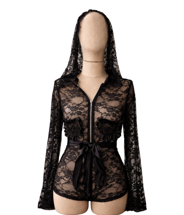 Sheer Black Lace Hooded 3-Piece Lingerie Set with Satin Tie